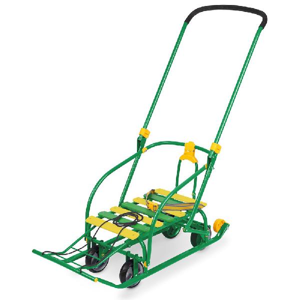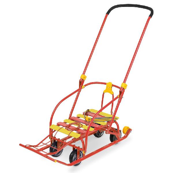 каркас, ручка и полозья изготовлены из металла; широкие полозья длиной 40 см обеспечивают легкое скольжение по снегу и предотвращают застревание в сугробах; привязанная в передней части веревка позволяет тянуть за собой санки; металлическая складная ручка дает возможность толкать транспортное средство; специальный ножной рычаг упрощает переключение на колесную базу; удлиненная база дает возможность ребенку комфортно расположиться; высокие бортики по бокам и сзади исключают вероятность выпадения малыша во время поездки; ремни безопасности обеспечивают дополнительную защиту. Удобство для мамы и малышаКонструкция санок разборная, что дает возможность сложить их при необходимости. Это значительно упрощает транспортировку санок. Небольшой вес (всего 5 кг) позволяет без труда перемещать конструкцию в любое место, например, поднимать или опускать по лестнице. Спинка, ручка и иные детали легко складываются. Процесс сборки или разборки занимает всего одну минуту