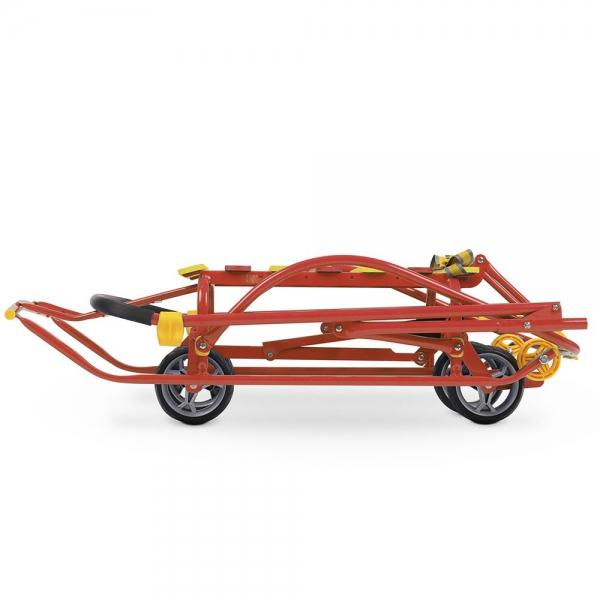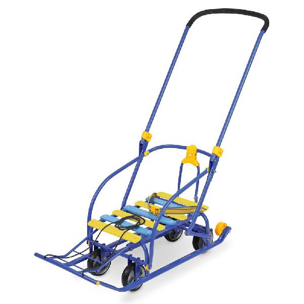 каркас, ручка и полозья изготовлены из металла; широкие полозья длиной 40 см обеспечивают легкое скольжение по снегу и предотвращают застревание в сугробах; привязанная в передней части веревка позволяет тянуть за собой санки; металлическая складная ручка дает возможность толкать транспортное средство; специальный ножной рычаг упрощает переключение на колесную базу; удлиненная база дает возможность ребенку комфортно расположиться; высокие бортики по бокам и сзади исключают вероятность выпадения малыша во время поездки; ремни безопасности обеспечивают дополнительную защиту. Удобство для мамы и малышаКонструкция санок разборная, что дает возможность сложить их при необходимости. Это значительно упрощает транспортировку санок. Небольшой вес (всего 5 кг) позволяет без труда перемещать конструкцию в любое место, например, поднимать или опускать по лестнице. Спинка, ручка и иные детали легко складываются. Процесс сборки или разборки занимает всего одну минуту